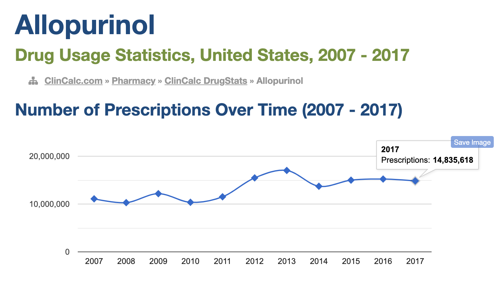 别嘌醇是一个老药了,1966 年在美国被FDA批准上市,到现在已经经过了半个世纪的使用。根据相关统计,别嘌醇在美国一年被开的处方次数为 1400 万次,在 2017 年排名第 54 位。