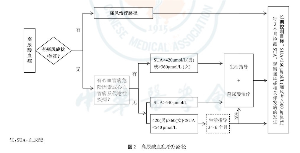 《高尿酸血症和痛风治疗的中国专家共识》 建议:如果低嘌呤饮食的情况下,高尿酸还在 540 以上,或高于420(男)/360(女)持续半年以上,即需要进行降尿酸治疗(下图)。