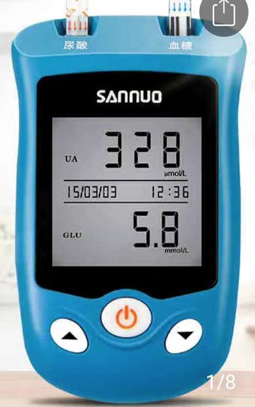 精确地测量尿酸值,需要到医院抽晨血(抽血前不能进食)。我自己研究发现,可以购买尿酸测试仪在家自行测量,用于定期的监控。我买的是三诺的 EA-12 测试仪(下图),别的品牌也没试过。