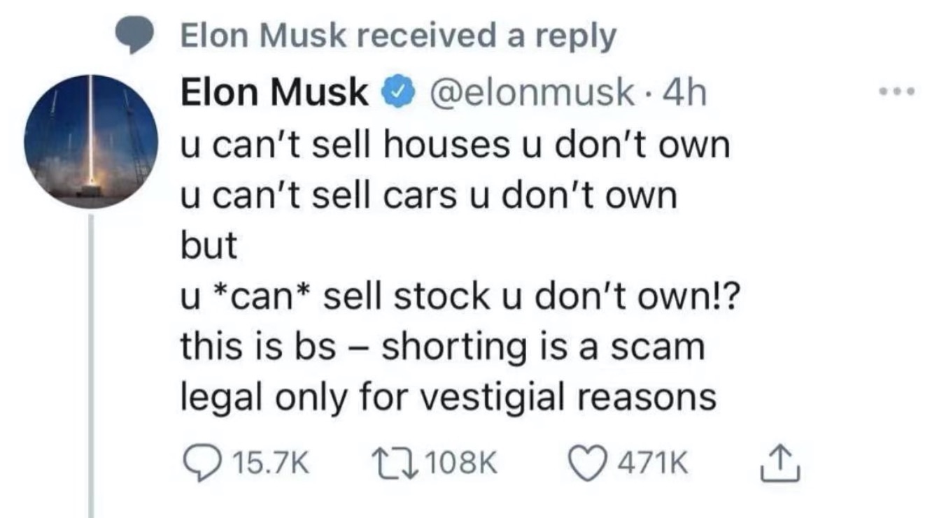 而马斯克也看热闹不嫌事大,在 Twitter 上说卖空是合法的骗局,因为特斯拉也经历过多年的做空。