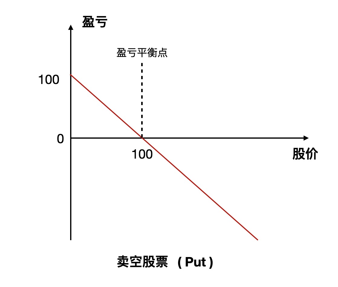 当你的保证金即将不足的时候,你就会面临券商的强行平仓。理论上做空一支股票,你的收益最高则是这个股票卖空时的价值,但这个股票如果一直上涨的话,你的理论亏损是无穷大的。假设股票卖空时值100美元,下图是收益图: