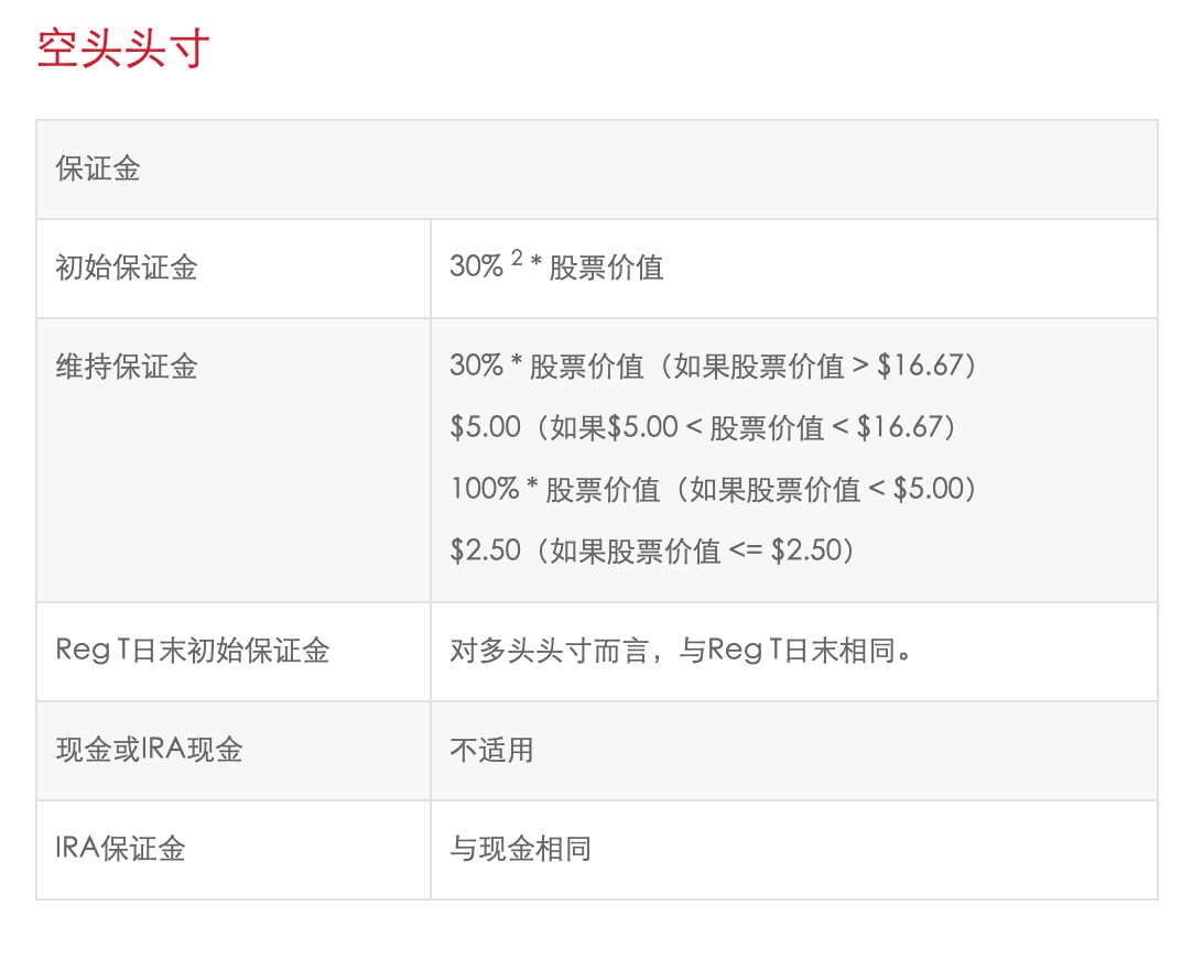 具体的保证金规则比上面的举例要复杂,但大体的规则都是随着股价上涨,帐户需要提供更多的保证金。下图是盈透证券的保证金规则: