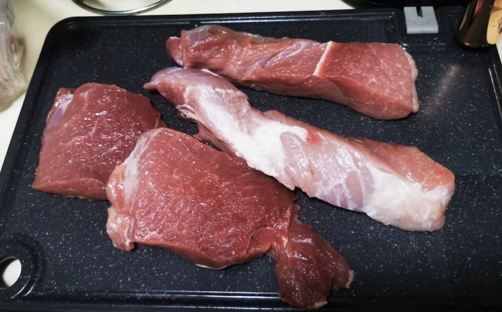 把梅花肉(买不到梅花肉也可以买前腿肉)去皮,切成长条状(长度大概宽2指,厚1指),如下图。