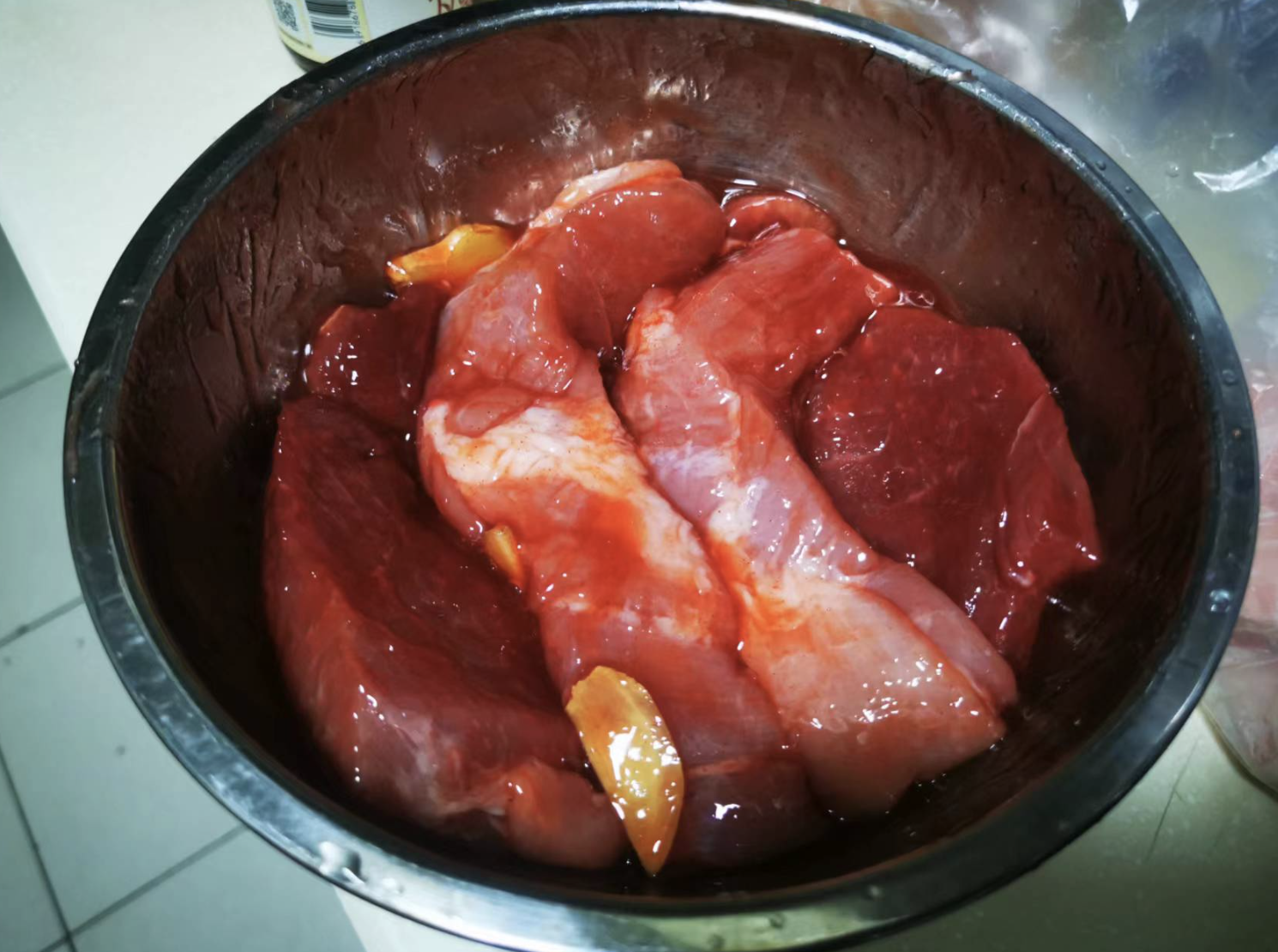 接着把肉放入小盆中,盖上保鲜膜,放冰箱里至少放置 4 小时,中间可以翻动一次,最好放一整晚,这样比较入味。