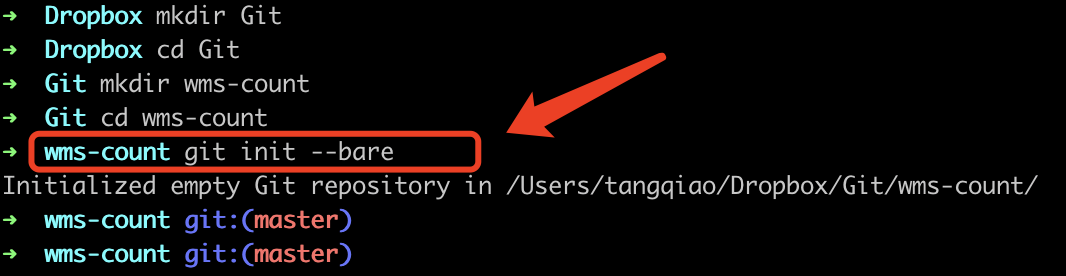 2、同步地,我们在 DropBox 目录下,新建一个对应的同步目录,在目录下,使用 git init --bare 进行初始化(如下图)。该指令只会创建一个空的 Git 仓库,同时没有工作区和缓存区。