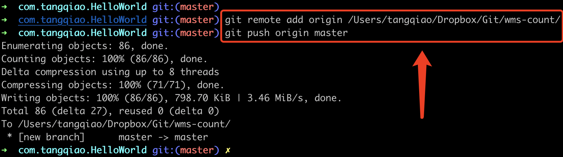 4、最后执行 git push origin master 将代码同步到 DropBox。