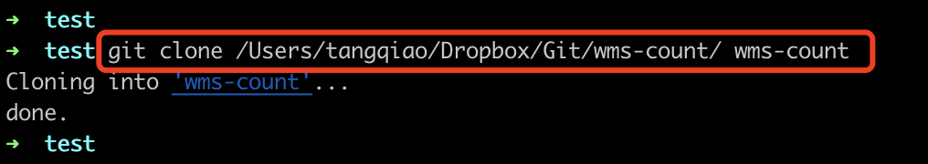 6、当我们要在另一台电脑上下载这个工程时,只需要这样:git clone <DropBox仓库目录> <本地目录> 即可(如下图)。