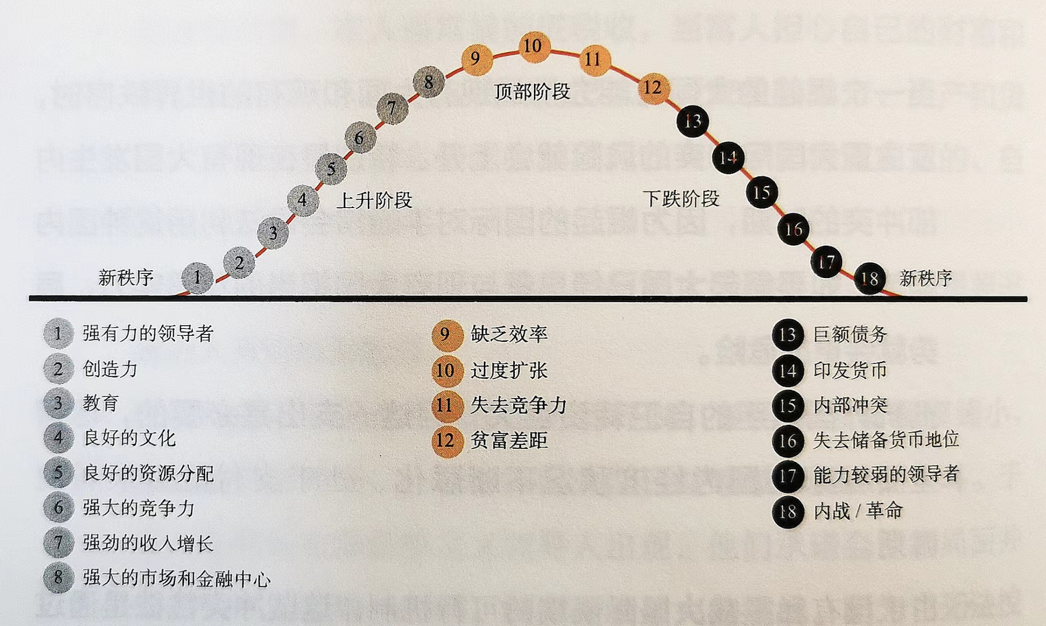 而在不同的周期中,国家会有不同的特征。例如:在上升阶段,国家重视教育。而在下跌阶段,国家会有巨额债务。