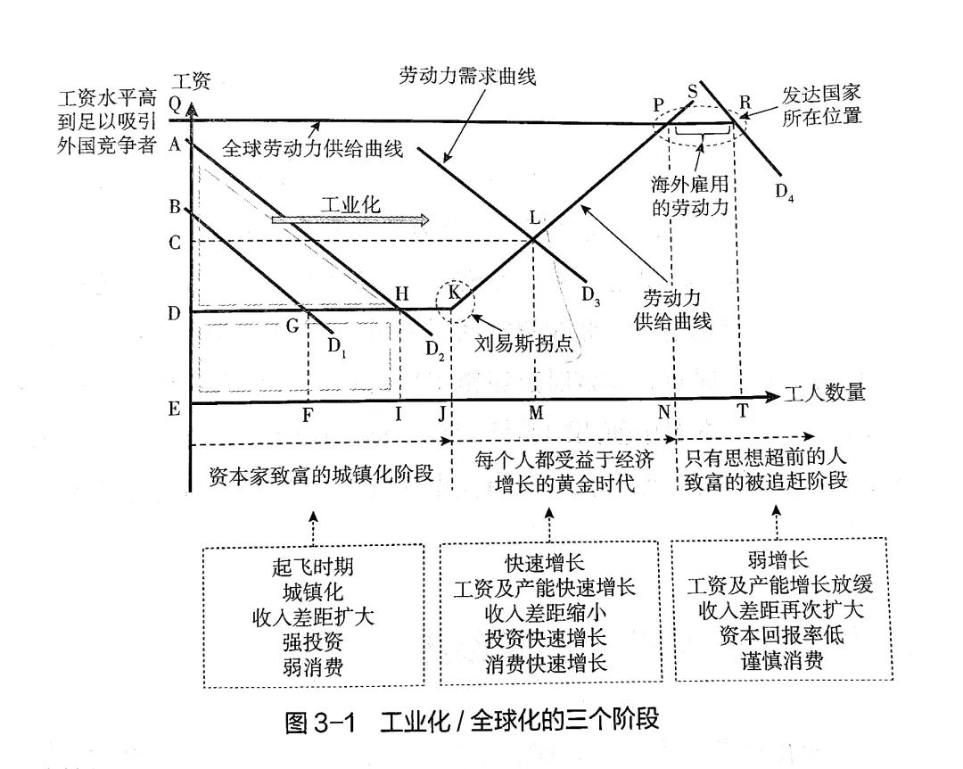 作者根据经济体工业化程度的不同,将经济发展划分为三个阶段(如下图):