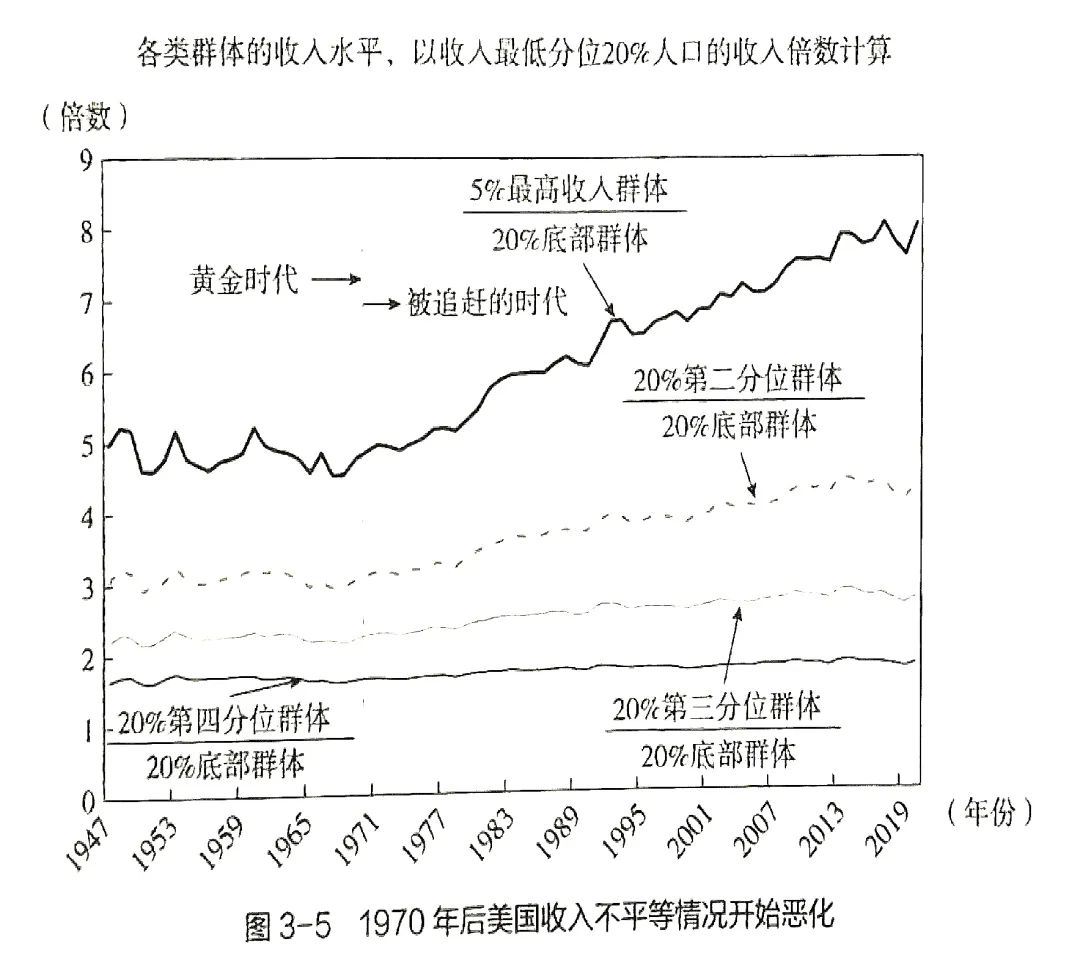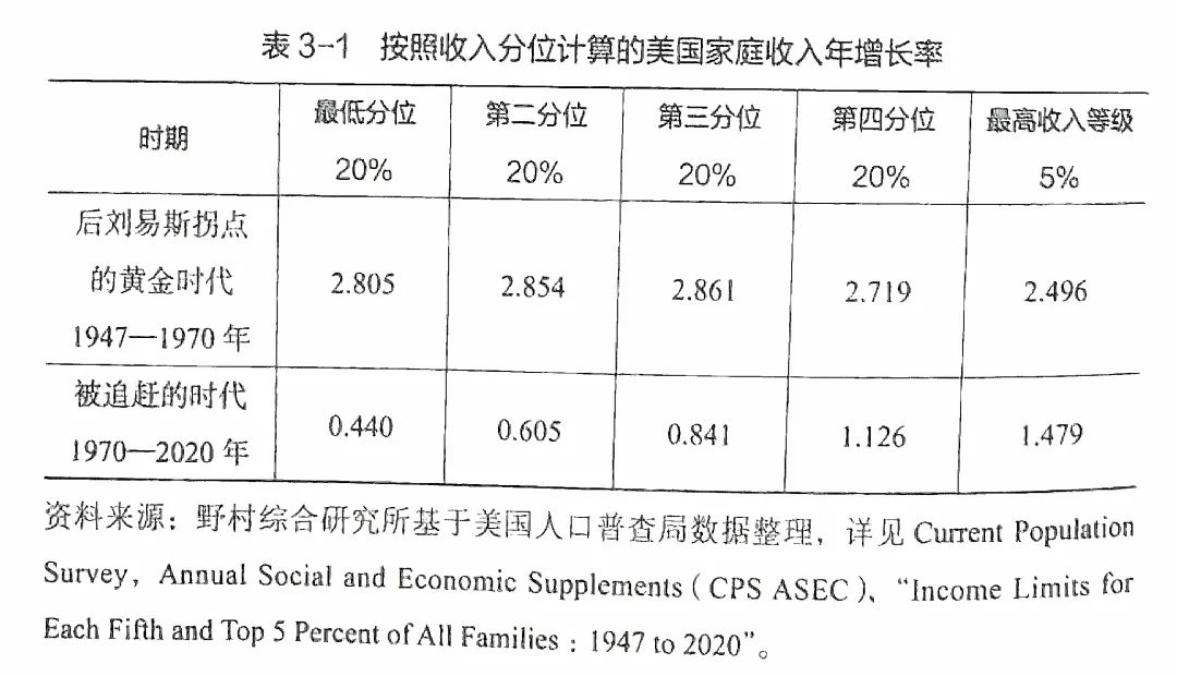 从美国的工资增长率(下图)来看,也能显著看出,在黄金时代,穷人工资增长快;在被追赶的时代,富人的工资增长更快。