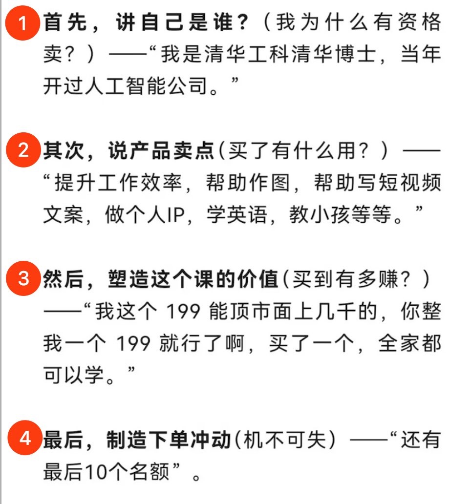 你只能抓住这仅有的 1 分钟时间,迅速完成需求挖掘,产品介绍,引导下单的过程。从这个角度看,李一舟的直播话术还挺高效的。但是,李一舟不应该撒谎,“仅有 10 个名额”这个说法对用户是一种欺骗,其实有更好的处理方式。