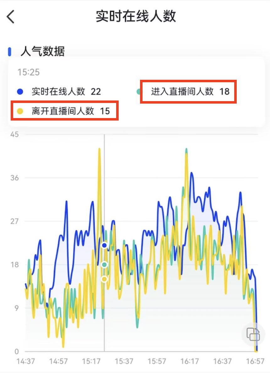 李一舟为什么要讲这么简洁?因为如果你随便看一个直播间的在线人数,你就会发现,每一分钟,都有超过 20% 的人离开,又会有超过 20% 的人新进入直播间。下图是一个案例,在该案例中,实时在线只有 22 人,但是每分钟进出直播间的人数分别达到了 18 人和 15 人。