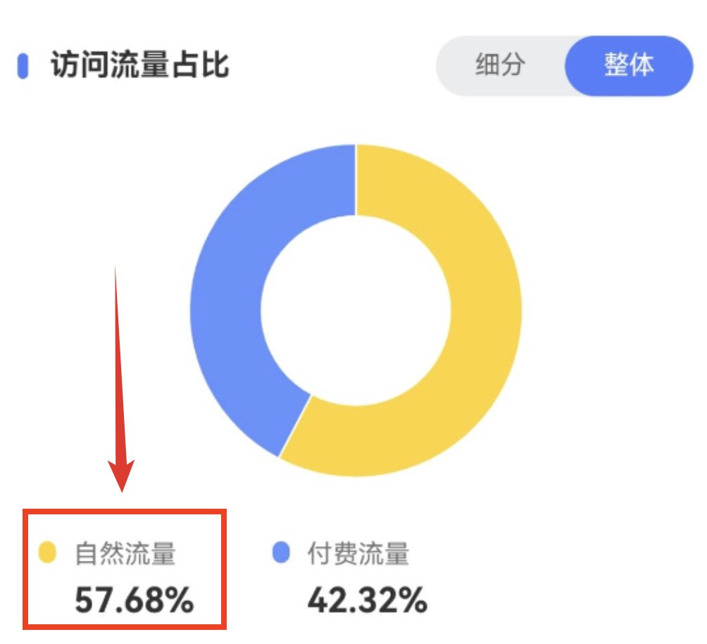 直播间的主播讲得不管多么好,没有观众也不行。流量在很多别的平台就是付费广告,但是在抖音,还有一大部分是“自然流量”。下图是某个直播间的流量图,可以看到,它有将近一半的自然流量,这部分流量是不需要给抖音付费的。