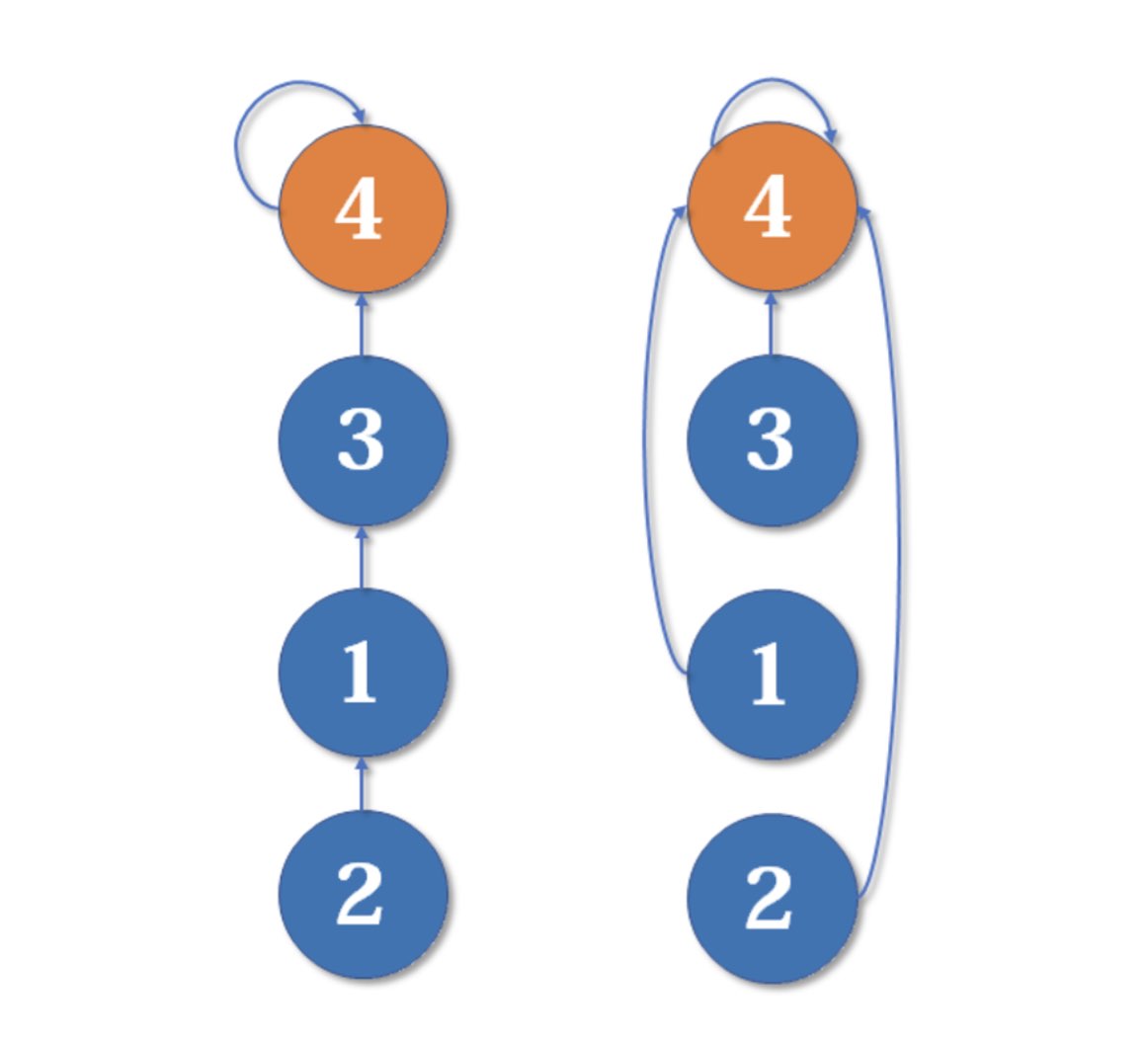 我们在这儿,也顺便引入路径压缩的优化,告诉学生在返回值的时候,如果更新结点,就可以把下图中的长路径“拍扁”,使得下次查询的时候速度更快。