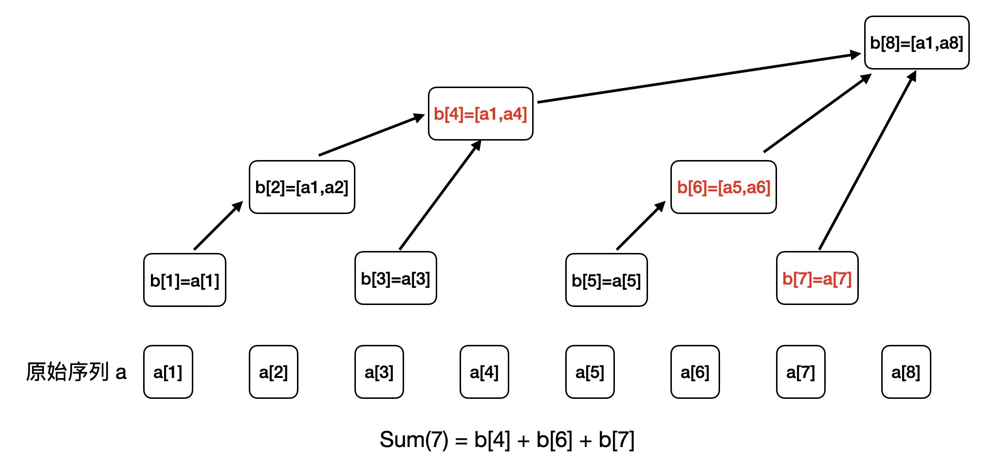 于是,如果我们要求 Sum(7),就可以用 b[7] 开始累加,然后用 7 - lowbit(7) 得到 6,再用 6 - lowbit(6) 得到 4,最后 4 - lowbit(4) = 0,就结束整个求和累加过程。
