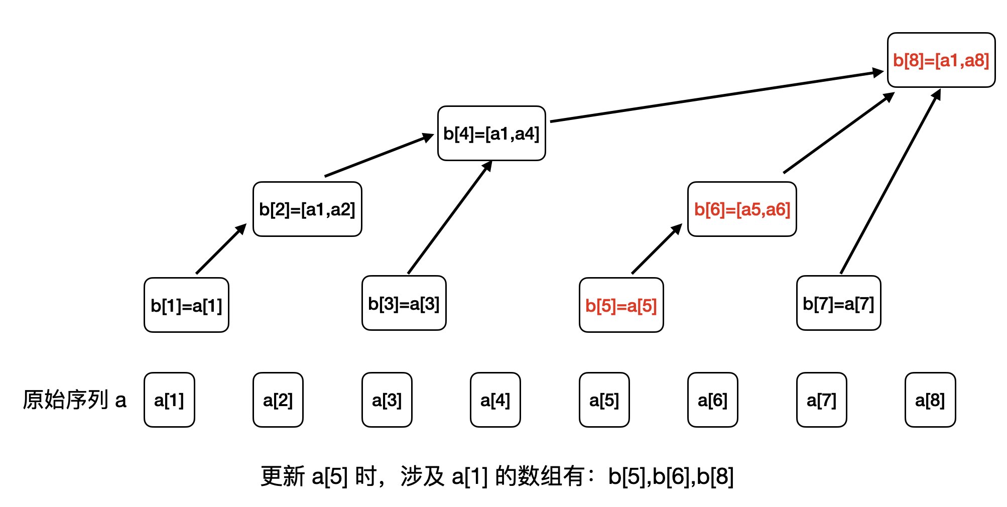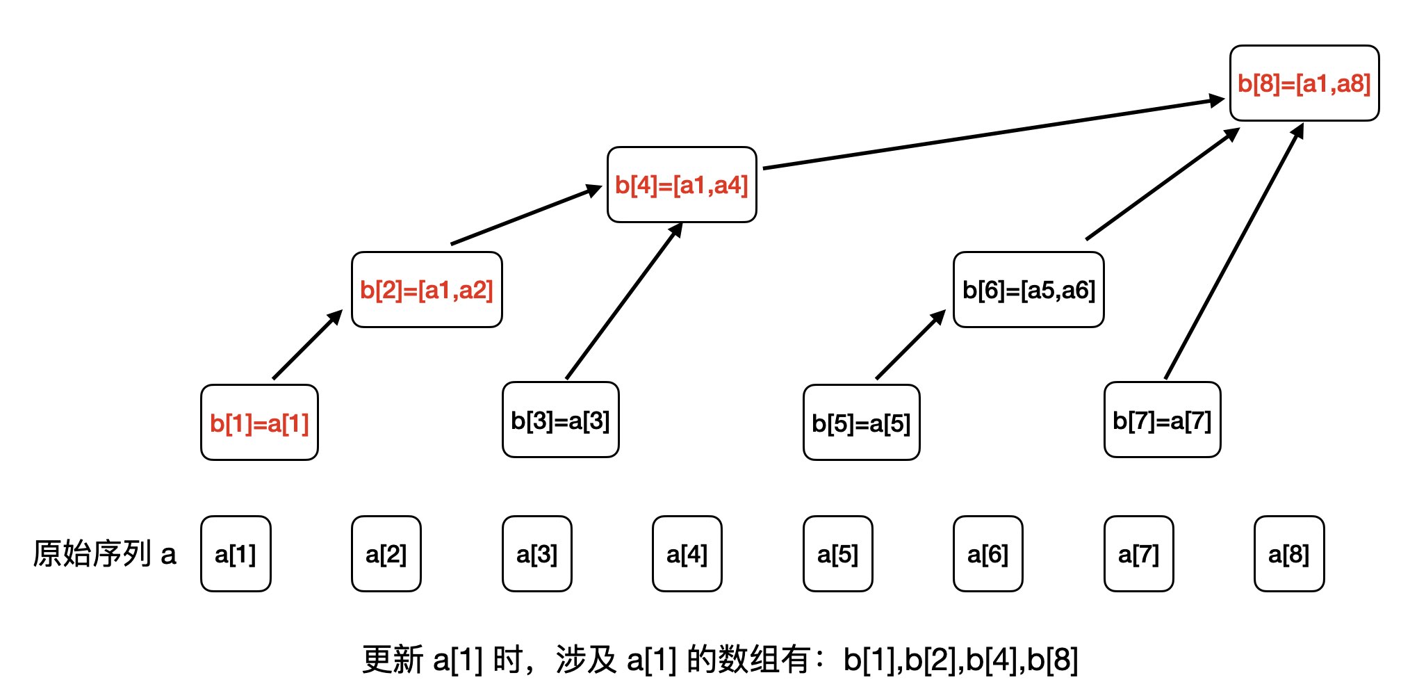 我们以更新 a[1]为例,通过观察,我们发现涉及 a[1] 的数组有:b[1],b[2],b[4],b[8],如下图所示: