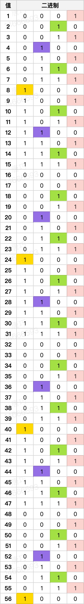 我们再从另一个角度来看管辖区间:我们把数状数组的第 1 个到第 56 个元素的二进制列出来,如下所示: