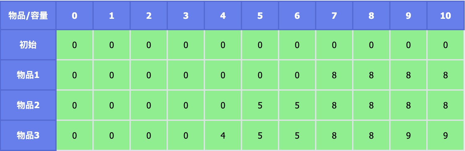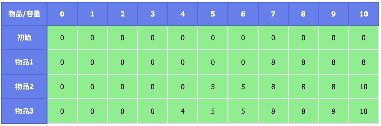 题目变为完全背包后,可以看到最后答案变了,最优方案变成了放入两个物品 2,得到最大价值 10。