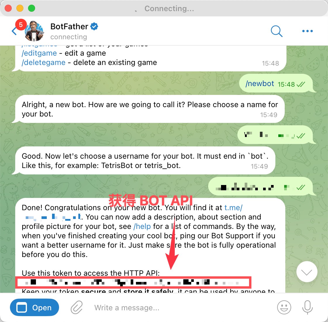 我本来还申请了飞书的 Bot,但是发现比 Telegram 麻烦很多,为了快速测试,就放弃了飞书。