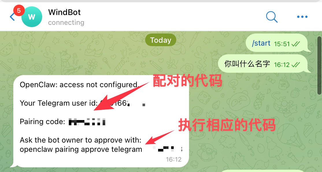 用你的 Telegram 给 BOT 发一条信息,然后 OpenClaw 会回复你 Pairing code。在你的命令行中执行回复内容的最后一行代码,类似这样: