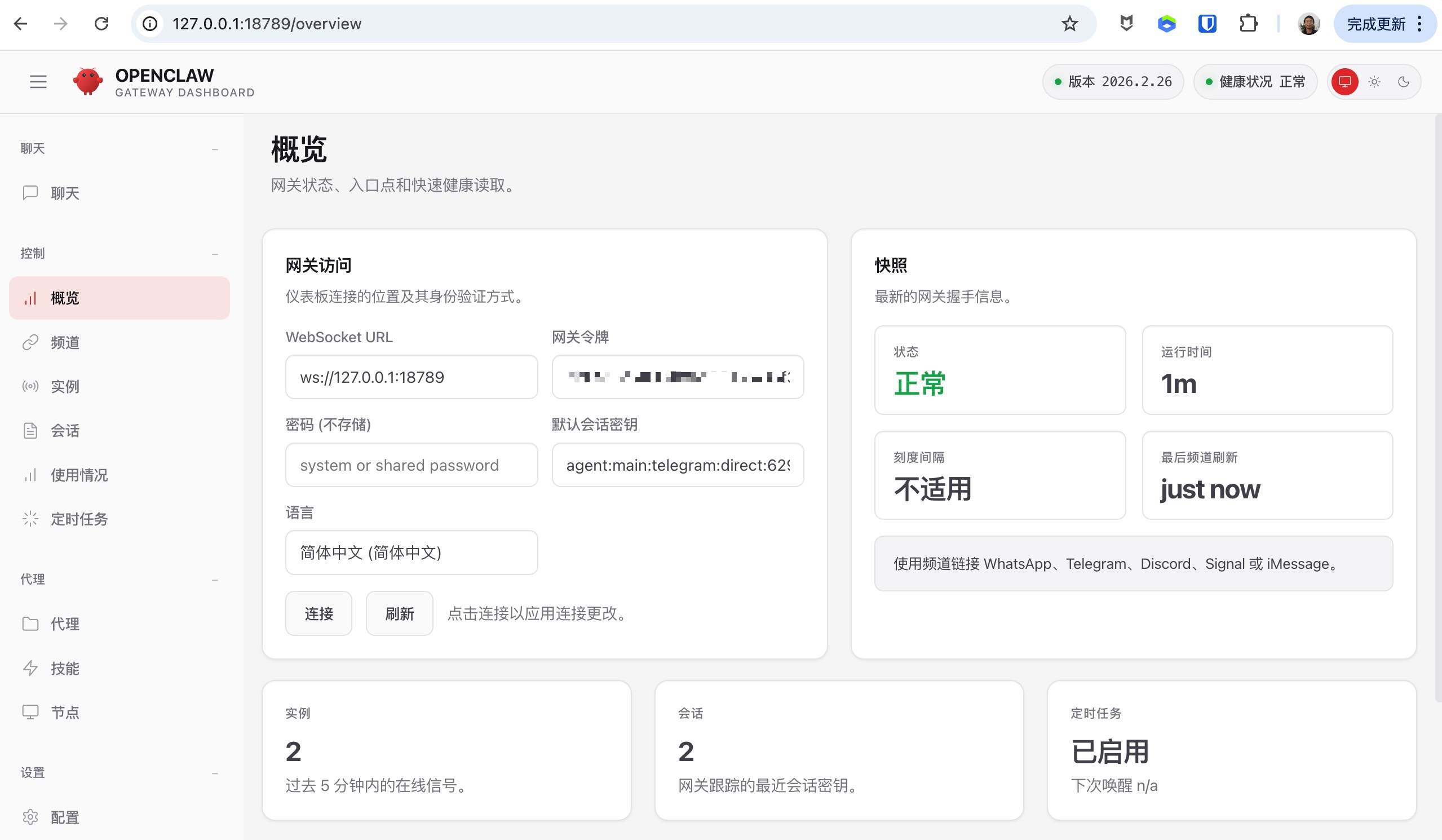 现在你就可以和 OpenClaw 用 Telegram 聊天了。你也可以打开网页版的控制面板,默认在 http://127.0.0.1:18789/ 查看到相关的信息。